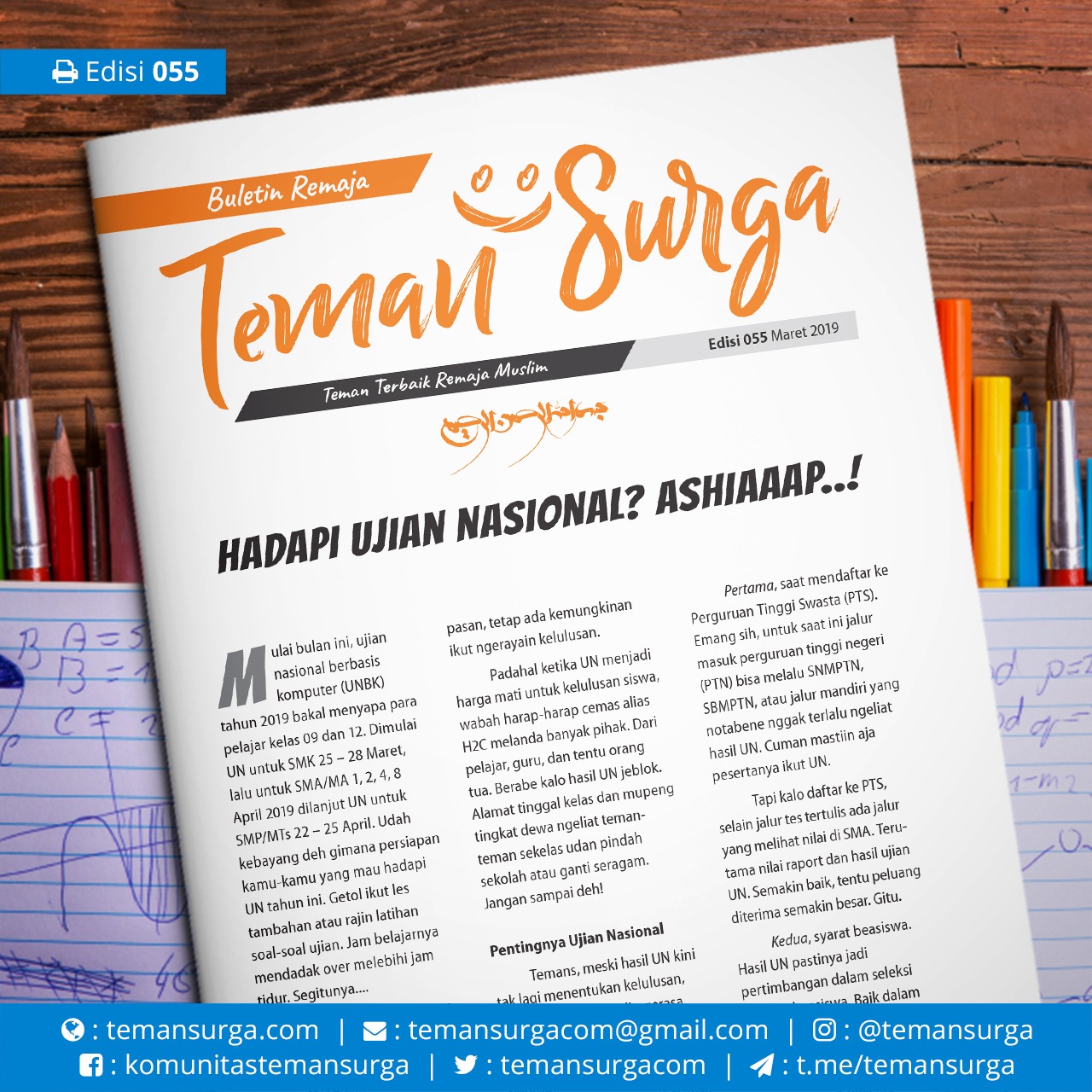 buletin teman surga 055. hadapi ujian nasionalMulai bulan ini, ujian nasional berbasis komputer (UNBK) tahun 2019 bakal menyapa para pelajar kelas 09 dan 12. Dimulai UN untuk SMK 25 – 28 Maret, lalu untuk SMA/MA 1, 2, 4, 8 April 2019 dilanjut UN untuk SMP/MTs 22 – 25 April. Udah kebayang deh gimana persiapan kamu-kamu yang mau hadapi UN tahun ini. Getol ikut les tambahan atau rajin latihan soal-soal ujian. Jam belajarnya mendadak over melebihi jam tidur. Segitunya….