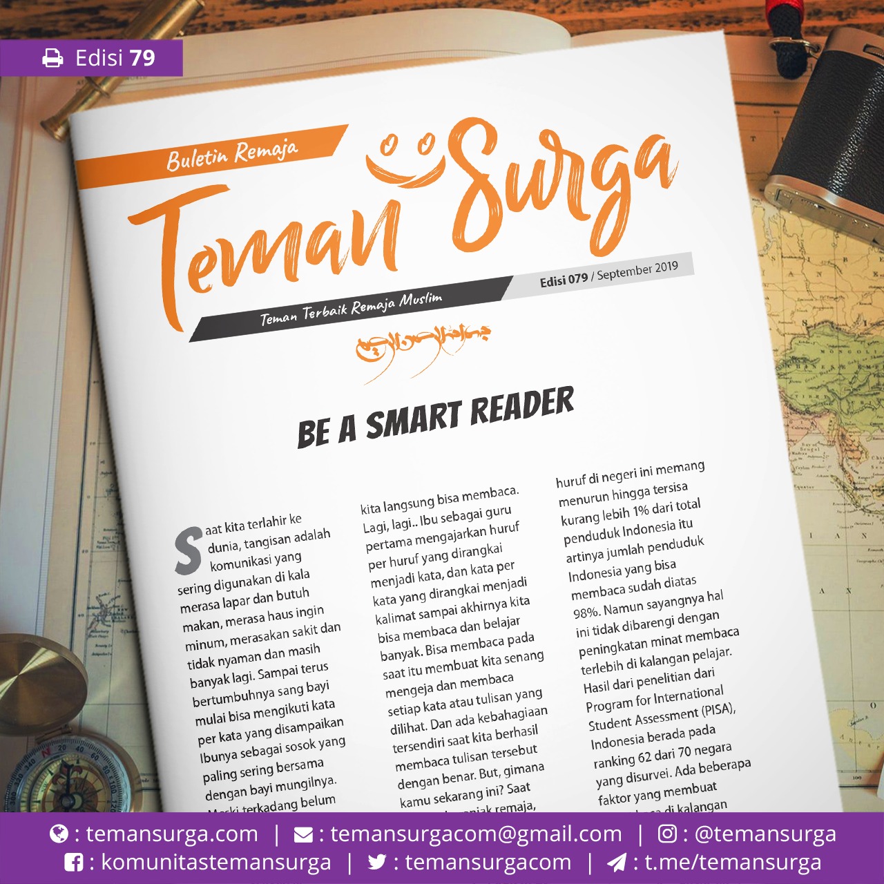 Iqra!! Bacalah!! Ayat pertama dari surat Al-Alaq yang memerintahkan untuk membaca. Karna dari membacalah kita dapat mengetahui tentang banyak hal. that’s why orang yang hobinya membaca pasti orang yang punya wawasan luas dan pengetahuan yang banyak. Yakin deh, orang kaya gini ngga akan tulalit kalau diajak ngobrol atau diskusi tentang apa saja. Kalau menurut kebanyakan orang, gaul itu yang slalu mengikuti apa saja yang sedang happening. Tapi, bagi versi Teman Surga gaul itu yang tahu tentang banyak hal dan tak segan membagi ilmunya kepada yang membutuhkan. Ngga keren kan, dandanan modis stylish tapi pas ditanya ini dan itu jawabnya cuma garuk-garuk kepala karna ngga tahu.