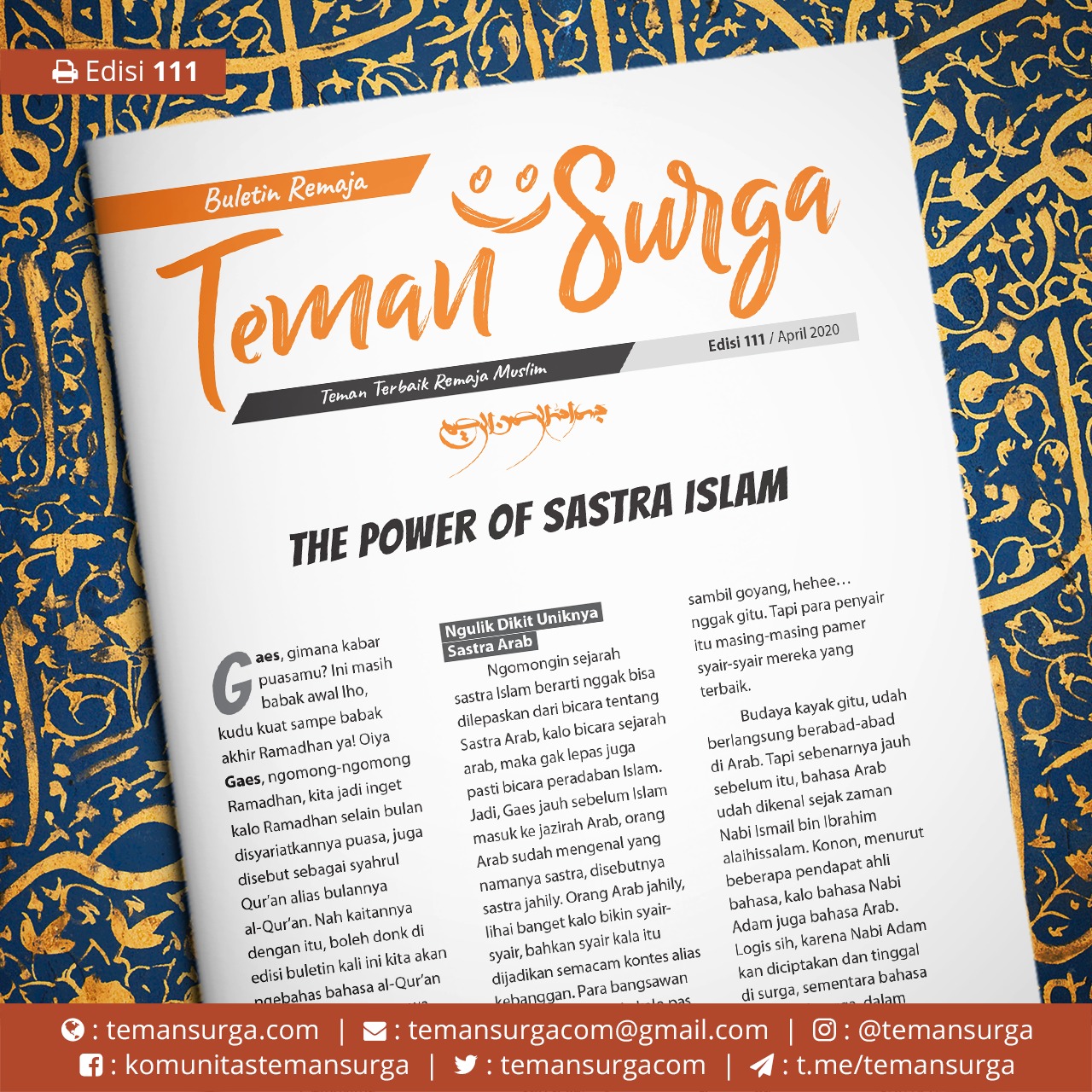 buletin teman surga 111. the power of sastra islamGaes, gimana kabar puasamu? Ini masih babak awal lho, kudu kuat sampe babak akhir Ramadhan ya! Oiya Gaes, ngomong-ngomong Ramadhan, kita jadi inget kalo Ramadhan selain bulan disyariatkannya puasa, juga disebut sebagai syahrul Qur’an alias bulannya al-Qur’an. Nah kaitannya dengan itu, boleh donk di edisi buletin kali ini kita akan ngebahas bahasa al-Qur’an sebagai bahasa Islam, wa bil khusus sastra Islam. Jadi, yuk siapin energimu untuk menyimak tulisan ini sampe selesai, menemani ngabuburit sambil baca buletin Teman Surga, ahay asoy bener!
