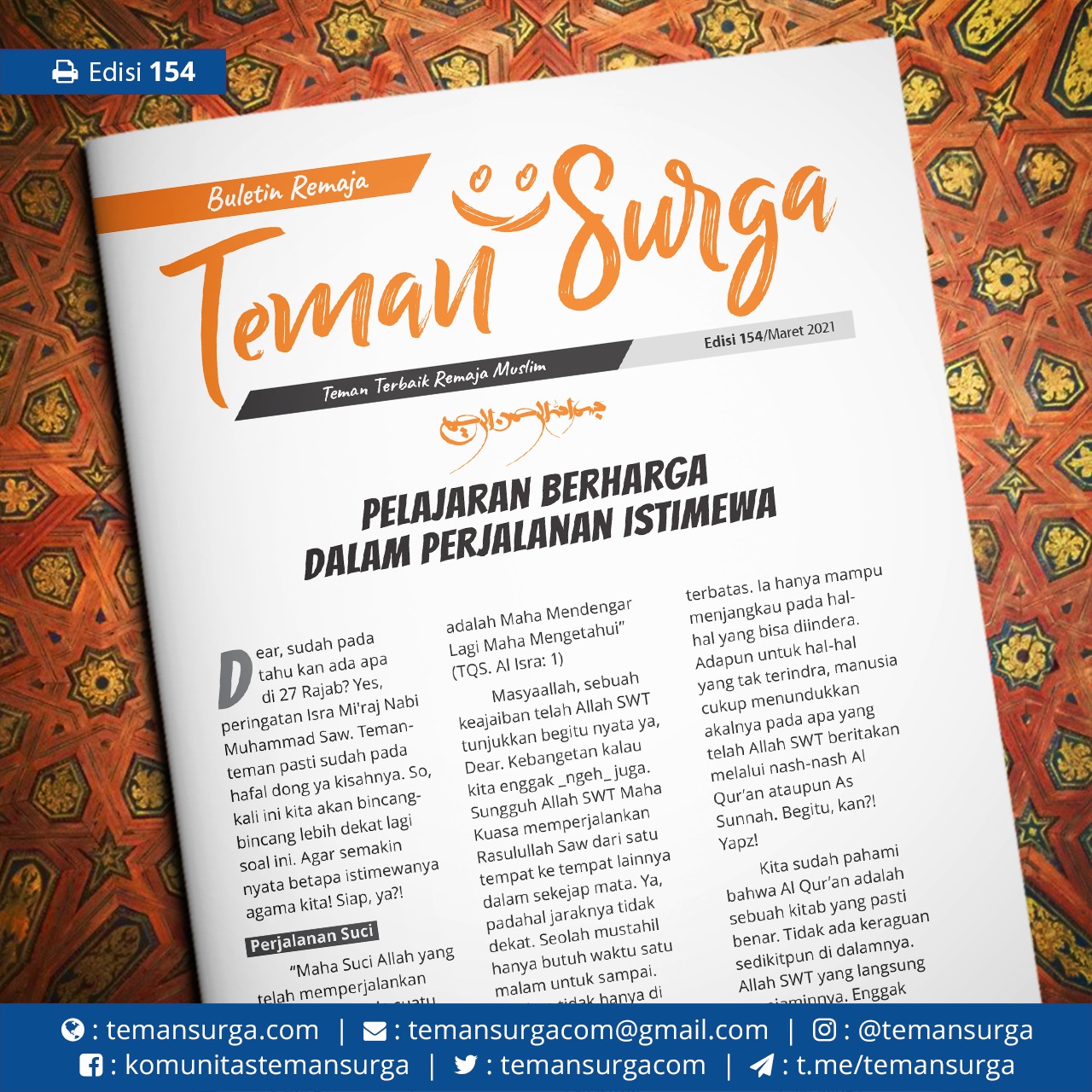buletin teman surga 154 pelajaran berharga dalam perjalanan istimewaDear, sudah pada tahu kan ada apa di 27 Rajab? Yes, peringatan Isra Mi’raj Nabi Muhammad Saw. Teman-teman pasti sudah pada hafal dong ya kisahnya. So, kali ini kita akan bincang-bincang lebih dekat lagi soal ini. Agar semakin nyata betapa istimewanya agama kita! Siap, ya?!