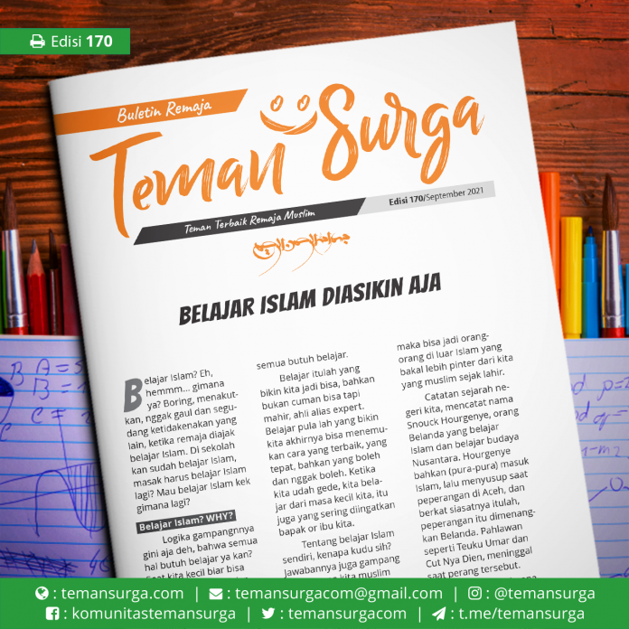 Belajar Islam? Eh, hemmm… gimana ya? Boring, menakutkan, nggak gaul dan segudang ketidakenakan yang lain, ketika remaja diajak belajar Islam. Di sekolah kan sudah belajar Islam, masak harus belajar Islam lagi? Mau belajar Islam kek gimana lagi?