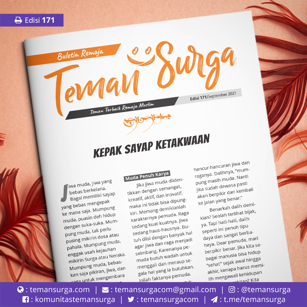 Dear #TemanSurga, yuk kepakkan sayap ketakwaan kita. Sebagai pemuda muslim, maka hanya takwa yang menjadi sayap bagi kita untuk meraih bahagia. Sayap takwa yang akan menyelamatkan kita dari durjananya dunia. Sayap takwa yang akan menghantarkan kita pada tujuan hidup mulia di dunia dan akhirat. Sayap takwa, inilah yang akan membawa kita untuk sampai ke Surga.