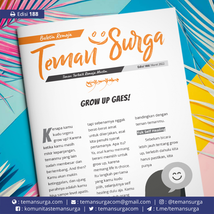 Yes, let’s grow up now! Mungkin mudah dilisankan, tapi sebenarnya nggak berat-berat amat untuk dikerjakan, asal kita penuhi syarat pertamanya. Apa itu? Ya, asal kamu memang berani memilih untuk grow up, karena memang life is choice. Itu langkah pertama yang kamu kudu pilih, selanjutnya self healing dulu aja. Kamu belum butuh orang lain, bangkitkan dari dalam diri kita sendiri, jangan memandang insecure, karena sering membanding-bandingkan dengan teman-temanmu.