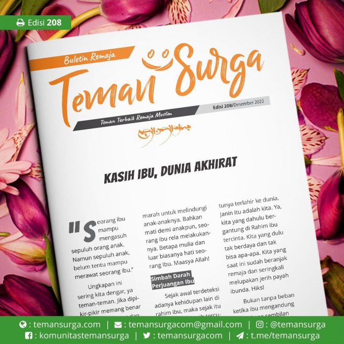 Maasya Allah, begitu mulia kedudukan ibu di mata Allah SWT. Maka sudahkah kita memuliakannya? Jangan tunggu nanti ya, Guys. Yuk segera kita labuhkan bakti kepada ibu. Sepanjang masa, di setiap helaan nafas kita. Sebab ibu pun demikian, kasihnya ibu berkekalan untuk kita di dunia hingga akhirat kelak. Semoga kita bisa berkumpul dengan ibu tercinta dengan bahagia. Tidak hanya di dunia tapi juga hingga Surga. Amiin! []