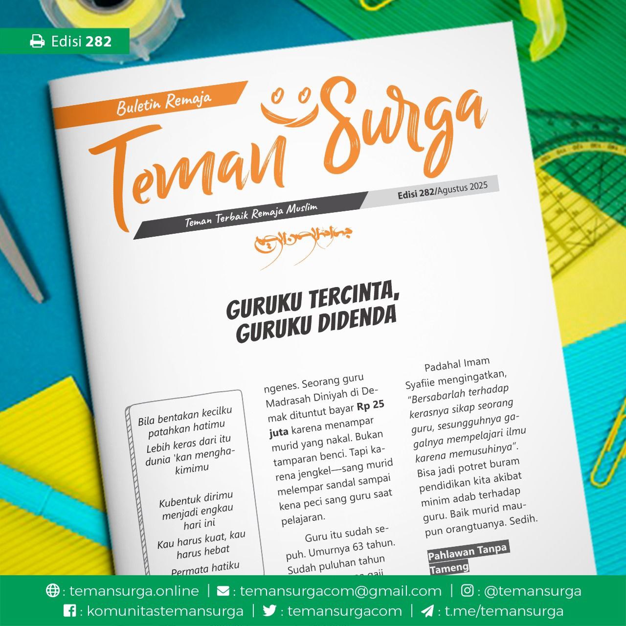 Akhir-akhir ini jagat maya sempat heboh. Bukan karena drama seleb yang hamil di luar nikah, tapi karena kisah nyata yang lebih ngenes. Seorang guru Madrasah Diniyah di Demak dituntut bayar Rp 25 juta karena menampar murid yang nakal. Bukan tamparan benci. Tapi karena jengkel, sang murid melempar sandal sampai kena peci sang guru saat pelajaran.